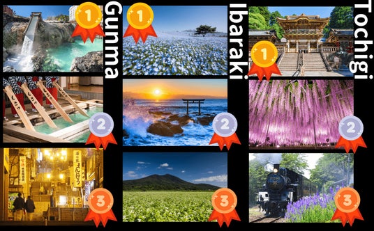 各県、誰もが納得の絵柄に決定いたしました。言わずと知れた温泉県である群馬は、3位まですべてが温泉に関わる絵柄に。絶景やパワースポットが満載の茨城は、丘一面に咲き誇るネモフィラと空と海が織りなす、ブルーの景色が美しい絵柄に。 山や花など美しい自然の宝庫・栃木ですが、圧倒的な票数で選ばれたのは王者、日光東照宮の陽明門でした。