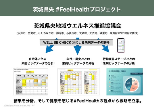 茨城県水戸市を中心とした、茨城県央9市町村(茨城県央地域ウエルネス推進協議会※2)(人口総数:69万7千人)と株式会社WELL BE INDUSTRY(代表取締役:花高 凌、東京都渋谷区、以下WBI)は、WBIが企画する #FeelHealth のコンセプトにおいて提携し、住民の健康意識の向上に向けた「健康を、感じよう。茨城県央 #FeelHealthプロジェクト」を実施します。