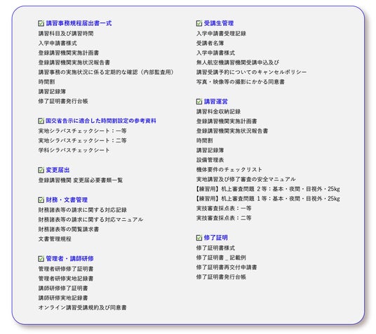 そこで申請や書類作成をはじめとする法務を専門とするバウンダリ行政書士法人が、登録講習機関サポート実績から蓄積されたノウハウを活かし、講習の運営や事務管理業務に役立つテンプレートや、航空局への各種申請や管理台帳の作成に使える書式サンプルなどを独自で作成。登録講習機関運営の書式テンプレート一式として販売、データ形式で提供することとなりました。