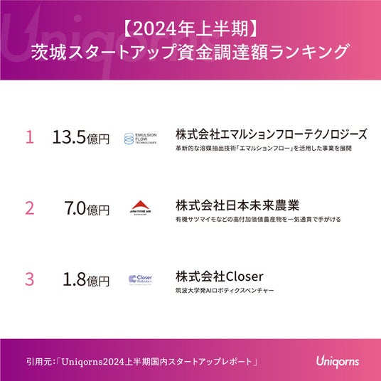 国内最大級のスタートアップメディア「Uniqorns(ユニコーンズ)」が2024年上半期の茨城スタートアップ資金調達状況をランキング形式で発表