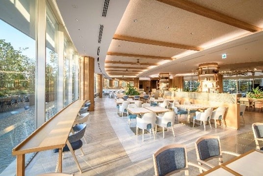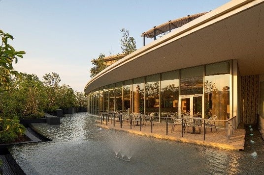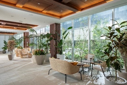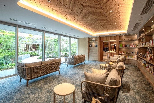また、約260席のダイニング※3は、外庭の緑と水景を臨めるメインダイニングだけではなく、中庭の緑やライトアップを眺めながらお酒を楽しめるガーデンバー、テラスなど、特色の異なるエリアを設けることで、その日の気分に合わせて自由に食事を楽しむエリアを選ぶことが可能です。テラスでは、ペットと一緒にお食事していただくことができ、株式会社PETOKOTOと連携した無添加自然素材のペット向けの食事もご用意しています。その他にも、書店「文喫」がプロデュースするパークウェルステイトシリーズ最多の蔵書数2100冊以上を誇るライブラリーや、公園を臨むフィットネスルーム、そして最上階には幕張ならではの海と空を一望できるスカイビューラウンジとパーティールームを設けています。