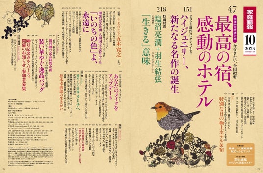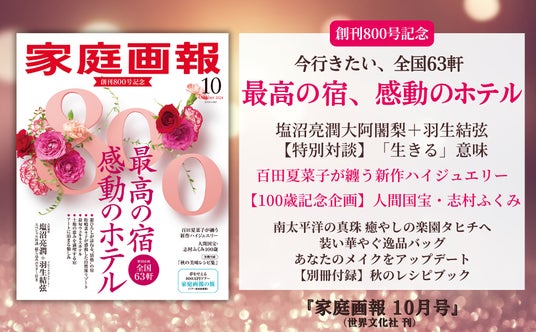 株式会社世界文化社は、創刊800号を迎えた『家庭画報 10月号』を8月30日(金)(関西・東海地区は8月29日)に発売しました。巻頭特集「最高の宿、感動のホテル」では、4つのキーワードで厳選した今行きたい全国63軒をご紹介。「塩沼亮潤大阿闍梨+羽生結弦 特別対談」では、”生きる意味”についてお二人の言葉を届けます。また、新作ハイジュエリーの大特集には百田夏菜子さんが登場。さらに、百寿を迎える人間国宝・志村ふくみさんの特別取材や、別冊付録「秋のレシピブック」など、創刊800号を迎えることができたことへの感謝を込め、「夢と美を楽しむ」内容でお届けします。