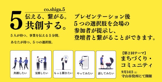 100個の新産業の共創を目指す「新産業のエコシステムビルダー」SUNDRED株式会社(所在地:東京都渋谷区、代表取締役CEO 兼 GM:留目 真伸、以下:SUNDRED)は、co.shiga(コードット シガ)実行委員会を主導して9月14日(土)に第2回「co.shiga.5」(コードット シガ ドットファイブ)を開催します。
