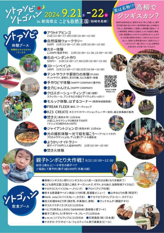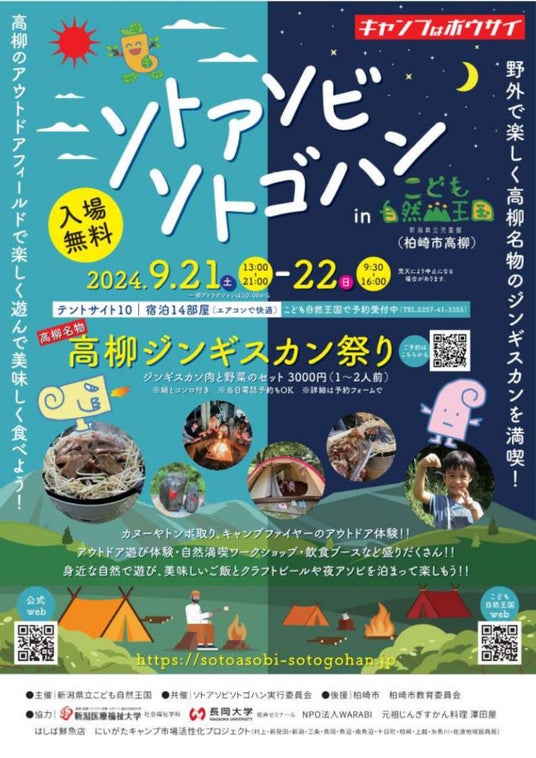 秋のキャンプシーズンに高柳名物のジンギスカンを味わいながら、アウトドアの各種体験やフードを親子で楽しんでみませんか。多くの皆様のご参加をお待ちしております。