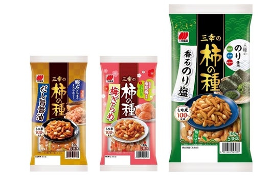 鰹だしをきかせた醤油味の定番「三幸の柿の種」、紀州産南高梅を使用した甘酸っぱい味わいが特徴の「三幸の柿の種 梅ざらめ」、お米とのりの豊かな風味が楽しめる「三幸の柿の種 香るのり塩」、毎日のおやつ・お茶うけに、またおつまみに、好みやその日の気分に合わせてお楽しみください。