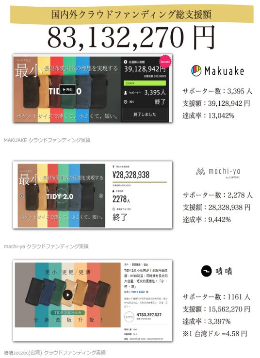 国内外クラウドファンディングにて総支援額8,313万円を達成したポケットサイズの「小さい長財布TIDY 2.0」をはじめとして、ついにクラウドファンディングでの資金調達が5億円を突破しました(2024年5月時点)。