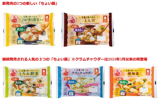 おかめ納豆・おかめ豆腐などでおなじみのタカノフーズ株式会社(本社:茨城県小美玉市、代表取締役社長 高野成徳 以下 タカノフーズ)は、「豆腐のおいしい食べ方の発見!体験!」をコンセプトに好評発売中、豆腐と食べるスープ「ちょい飯 とろみ野菜」「ちょい飯 酸辣湯」(とろみ野菜は野菜増量)に加え、「ちょい飯 しょうが香る根菜スープ」「ちょい飯 とん汁」を新発売。また、2024年3月まで発売していた人気の「ちょい飯 クラムチャウダー」を牛乳感とコクをアップさせ再発売します。新たに合計5品のバリエーションで2024年9月1日(日)より、エリア限定※で新発売いたします。