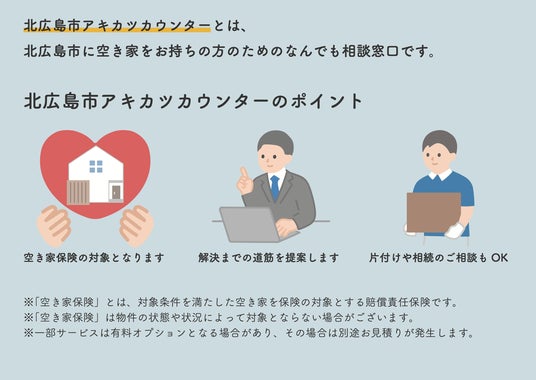 北広島市アキカツカウンターは、北広島市内に空き家を所有する方、同市内に空き家を相続される方、同市内の空き家の利活用を検討している全国の方のための相談窓口です。