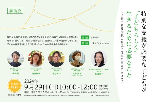 「特別な支援が必要な子どもが“子どもらしく”生きるために必要なこと~子育てする母親の育児と仕事の両立に向けて~」と題し、仙台エリアで支援の手を広げる法人、研究者が集結し講演会を開催いたします。