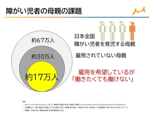 Hito Rehaを設立後、初めて相談を受けた障がい児の母親から「働きたくても働けない」現状について知ることになりました。調査を進めるうちに「約17万人」の母親が働きたくても働けない現状であることを理解しました。