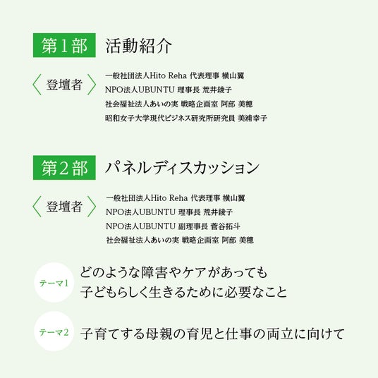 第2部では、パネルディスカッションとして「どのような障害やケアがあっても子どもらしく生きるために必要なこと」「子育てする母親の育児と仕事の両立に向けて」という2つのテーマで話をしていきます。登壇者は次の通りです。