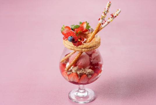 季節のフルーツや食材が持つ美味しさを最大限に引き出した、パティシエのイマジネーション光るシーズナルパフェ。可愛らしい「ピンク」のパフェを彩るいちごを主役に、フレッシュいちごの美味しさを引き立てるシフォンケーキやジュレ、シャーベットなど、華やかなビジュアルに仕立てました。