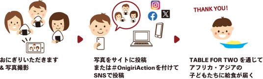 おにぎりアクションは、日本の代表的な食である「おにぎり」をシンボルに、おにぎりにまつわる写真をSNS[Facebook, Instagram, X(Twitter)]、またはおにぎりアクションの特設サイトに投稿すると、1枚の写真投稿につき給食5食分に相当する寄付(100円)を協賛企業が提供し、アフリカ・アジアの子どもたちに給食をプレゼントできる取り組みです。