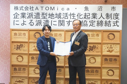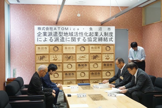 8月28日(水)に、魚沼市役所内において、地域活性化企業人の協定締結式を実施いたしました。式では、内田幹夫魚沼市長、魚沼市役所 産業経済部副部長 小島勉氏、ATOMica代表取締役Co-CEO 南原一輝、当社で魚沼市への派遣社員となるコミュニティマネージャー 野田国広が参加し、本取り組みについての説明と調印を行いました。