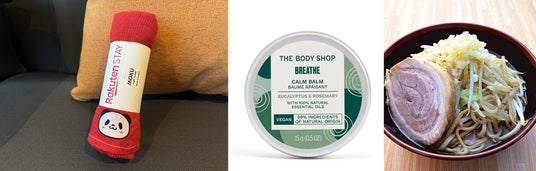 「お買いものパンダ」オリジナルデザインのフェイスタオル(左)、保湿バーム/ラーメンとチャーシューのセット(右)