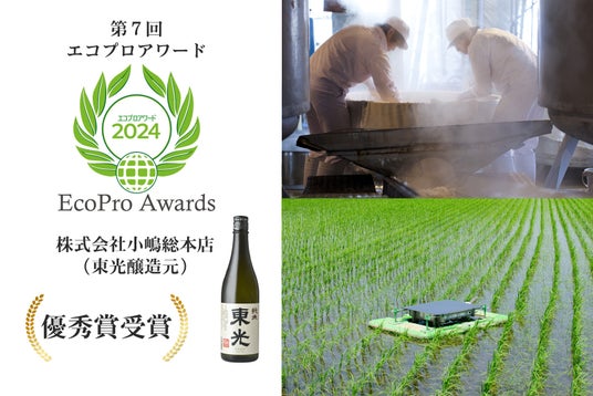 日本酒「東光」を醸造する株式会社小嶋総本店(所在地: 山形県米沢市、代表取締役社長: 小嶋健市郎)は、サステナブル経営推進機構(SuMPO)が主催する「第7回エコプロアワード」(後援:財務省、農林水産省、経済産業省、国土交通省、環境省、金融庁)にて優秀賞を受賞しました。「自社の酒粕を活用した再生可能エネルギーの創出」、「自動抑草ロボット・アイガモロボを使用した農薬不使用栽培とメタンガス抑制」など、酒造り・米づくりの全方位でカーボンニュートラルを実現する取り組みが評価されたものです。