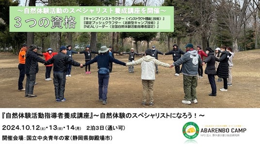 あばれんぼキャンプ(NPO法人 野外遊び喜び総合研究所:東京都)が、自然体験活動のスペシャリストを養成する講座を開催いたします。3つの資格を取得できるこの講座は、自然と共に生きる力を次世代に伝えることを目的としており、実践的なプログラムや指導理論などを習得します。本講座に参加することで、実際に自然を体験しながら指導スキルと理論を習得することができます。そして、地域社会で活躍の場を広げることも可能です。また、3つの資格取得と同時に、同じ志を持つ仲間とのネットワーク形成も期待できます。