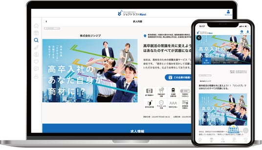 高卒採用に文字情報のみを用いていた企業の「求人票」の情報を、Webサイトやアプリに掲載した高校生のための求人情報メディアです。高校生は学校の進路指導室以外でも、スマホなどからいつでも情報にアクセスできます。