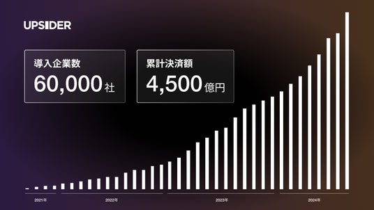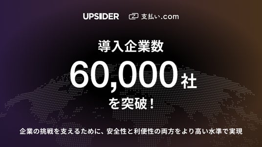 株式会社UPSIDER(代表取締役:宮城徹・水野智規、本社:東京都港区、以下 当社)は、当社が提供する「UPSIDER」「支払い.com」の合計導入企業数が60,000社を突破*1・法人カード「UPSIDER」の累計決済額が4,500億円を超えた*2ことを発表いたします。
