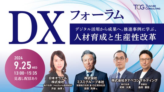 日本の経営コンサルティングのパイオニアである株式会社タナベコンサルティング(本社:東京都千代田区・大阪市淀川区、代表取締役社長:若松 孝彦)は、2024年9月25日(水)13:00~15:35に、無料ウェビナー「DXフォーラム~デジタル活用から成果へ。推進事例に学ぶ、人材育成と生産性改革~」を開催いたします。https://eu1.hubs.ly/H0bQwK60
