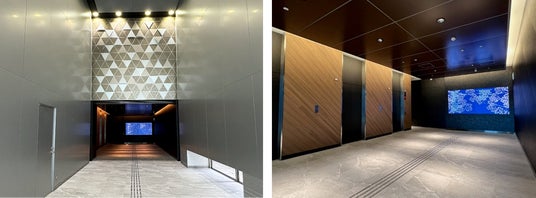 また、エントランスに設置していたテナントサインに代えて、大型LEDモニターを設置しました。モニターに入居テナント様名を表示させ、その背景には、ビジュアルアートを映し出し空間を演出しました。天気、気温、時刻といったインフォメーションや、災害時の緊急対策表示など、デジタル化によってさまざまな活用が可能となります。背景のビジュアルアートは、今後、いちごが運用する複数の物件においても展開し、学生や若手アーティストとのコラボなど、ESGの取り組みへの活用も予定しております。