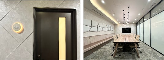 大勢でのミーティングへの対策として、最大20名程度が利用可能な貸会議室(10席+ベンチシート)をご用意しました。ガラスパーテーションでラウンジと一体空間とし、利用時はワンタッチでスモークガラスへの変更が可能となります。ベンチシートはBCP収納庫としての役割もあり、防災備蓄品を収納することで災害へ備えます。Web予約システムを導入し、テナント様の利便性向上と管理の手間を削減しました。