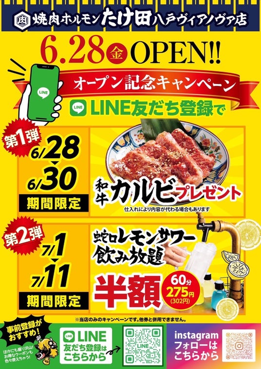 『日常価格でごちそう体験を』最高ランクA5黒毛和牛カルビや炊きたて土鍋ごはんなど、普段づかいでありながら上質な食体験をお値打ち価格で楽しめる焼肉ブランド「焼肉ホルモンたけ田」を運営する株式会社ミナモト(代表取締役:細田源太)は、同ブランド青森初出店となる『焼肉ホルモンたけ田 八戸ヴィアノバ店』2024年6月28日にグランドオープンいたします。また、オープンに合わせて名物 「蛇口レモンサワー飲み放題」が半額や黒毛和牛A5カルビが無料になるキャンペーンも同時に開催いたします。