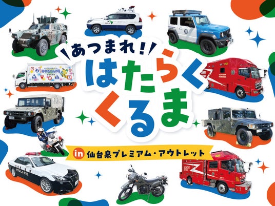 仙台泉プレミアム・アウトレット(所在地:宮城県仙台市 運営:三菱地所・サイモン株式会社)では、2024年9月28日(土)に、宮城県泉警察署、仙台市泉消防署、自衛隊宮城地方協力本部、NEXCO東日本、一般社団法人日本自動車連盟 (JAF)と連携し、各団体が所有する車両の展示や体験イベントなどが楽しめる「あつまれ!はたらくくるま in 仙台泉プレミアム・アウトレット」を初開催します。