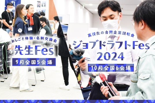 9月に名古屋、大阪、東京、神奈川、福岡の5会場で、高校の教員向けのおしごと体験交流会「先生Fes」を、10月には大阪、福岡、広島、仙台、東京、名古屋の6会場にて高校生向けの合同企業説明会「ジョブドラフトFes」を開催します。