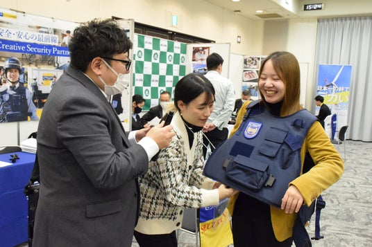 ▲防弾チョッキを試着する体験(大阪会場・警備)