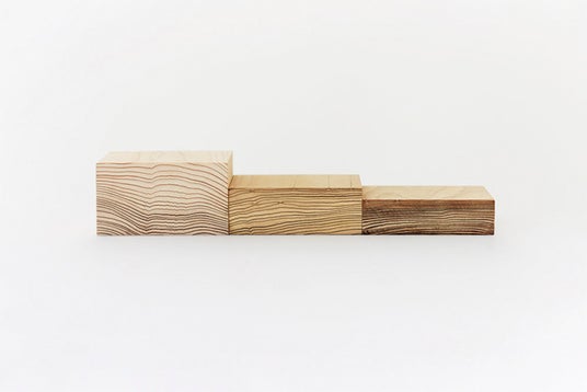 飛騨産業では2003年より杉を使って家具をつくる取り組みを続けています。戦後の住宅不足解消のために大量に植えられた杉や檜が、伐りどきを過ぎた状態で山に放置され山の荒廃が問題となるなか、杉をなんとか家具に活用できないかと考案したのが「杉圧縮材」です。元来柔らかく家具には向かないとされていた杉板を高温で圧縮することで、家具に使えるレベルに強度を高めた新素材です。本展では4人の作家による「杉圧縮材」を使用した作品が初公開されます。