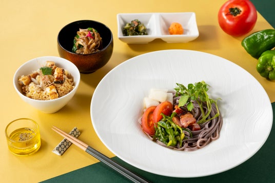 まだまだ残暑が厳しい初秋にぴったりな、阿武隈山系の天然水で育まれた田村市産の食材を生かした冷やし御膳です。田村市産の黒米粉を使用した「黒米延べ麺」は、田村市産の野菜やベーコンを添え、梅の酸味やおろし柚子胡椒の辛味、えごまオイルの風味をアクセントに、お好みで味わいの変化を楽しみながらお召し上がりください。”あぶくま高原福うなぎ”を使用し、山椒でほんのりと香りづけした混ぜご飯や、田村市産野菜の揚げびたしとともにお楽しみください。