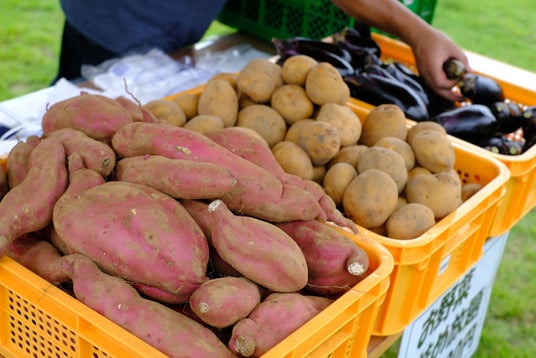 野菜詰め放題ジャガイモ、サツマイモ、なすの詰め放題。毎朝、地元の生産者が届ける新鮮な野菜を販売するフラワーパーク駐車場にある直売所。