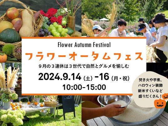 敬老の日に合わせて、3連休はさまざまな世代の方が楽しめるイベント盛りだくさんの「フラワーオータムフェス」を開催します。八郷の新米を味わう塩おむすびや米すくい、季節の恵みを感じられる地元食材を使った芋煮、焚き火、シャインマスカットのパフェなど、新鮮な旬のグルメをご用意!キッチンカーや、地元のクラフト作家たちのマルシェも出店。
