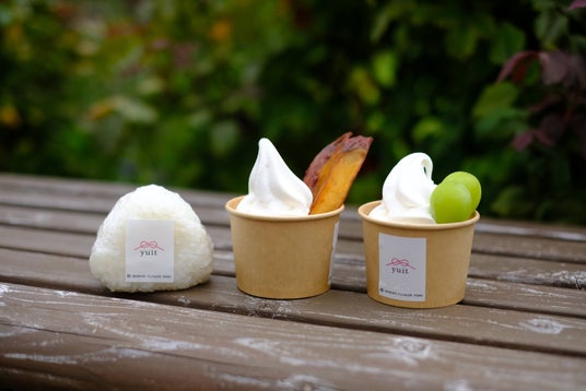 Yuit塩おむすび、ぶどうソフト八郷の新米塩おむすびや、シャインマスカットや大学芋トッピングのソフトクリーム