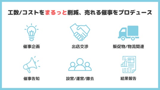 オリジナル催事コンテンツの企画・開発、全国の百貨店や駅ビルなどの商業施設との出店交渉、売場設営/撤去、催事運営、開催結果報告までをワンストップでご提供するのが 「まるごと催事」 です。催事に関わる業務を 「まるごと」 当社がお請けいたします。