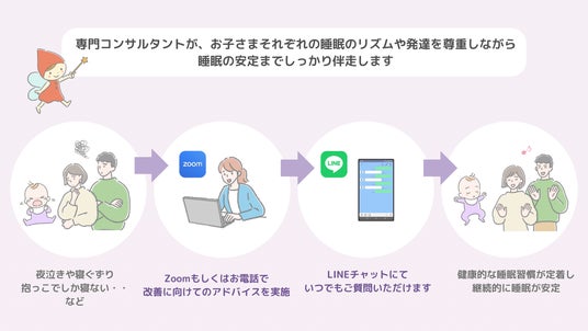 GuuMinは、乳幼児の夜泣きや寝ぐずりに悩むご家庭に対し、専門コンサルタントがお子さまそれぞれの睡眠のリズムや発達を尊重しながら、ご家庭に合わせたコンサルテーションプランを作成。LINEやZoomなどを介して睡眠の安定までしっかり伴走します。