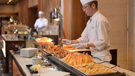 お客様の自由なスタイルで召し上がりいただくバイキングコーナーには、和洋にこだわらず、旬の山海バイキング料理や地産素材を中心としたいばらきの味を再現、地域に根付いた地場料理など海の幸や山の幸の競演です。また、フリードリンクコーナーでは、ソフトドリンクの他、ご夕食時には、各種アルコール飲料もご用意しています。