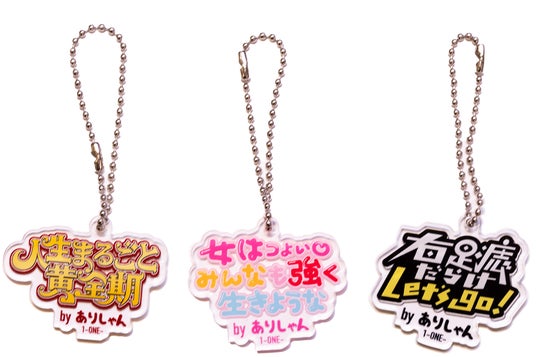 続けて、ありしゃんさんの名言をキーホルダーにしたオリジナルコラボグッズの抽選に参加。ありしゃんさんは「女はっょぃ(ハート)みんなも強く生きような」が1番のお気に入りだそう。「Instagramのストーリーにこのキーホルダーの写真を載せたら、仲間から『欲しい!』と連絡がきました!」と話し、「このギャルっぽい感じが可愛いんですよね!あと、『右足痣だらけLet’s go!』と『人生まるごと黄金期』は、ヘラヘラ三銃士の曲やテーマで出来た言葉なんですが、これだけ唯一、私がInstagramで発信したもので、特に名言を言おうとはしておらず、ナチュラルに生まれた言葉なので、たぶんこれが一番私の思いがこもった言葉なのかな」と教えてくれました。