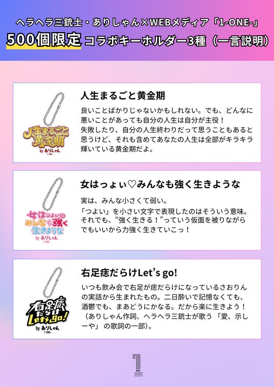 さらに、本イベントの目的に共感してくださった人気YouTuber・ありしゃんさん(ヘラヘラ三銃士)にご協力いただき、「1-ONE-」の公式LINEを友だち登録して、当日来場した先着500名様(各日250名様ずつ)には、ありしゃんさんの名言をキーホルダーにしたオリジナルグッズのプレゼントを行いました。