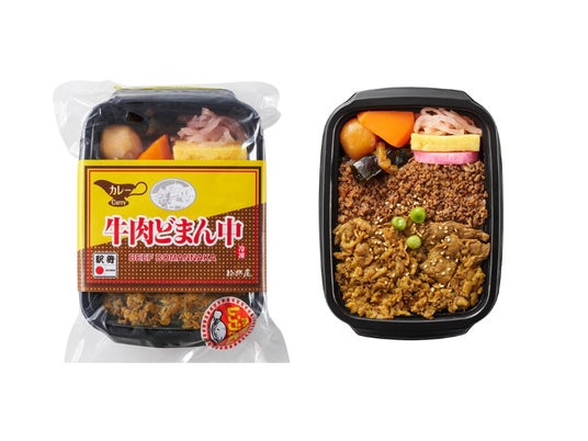 山形県産米「どまんなか」をふっくらと炊き上げ、秘伝のタレで味付けした牛肉煮と牛そぼろ煮をのせた牛丼風の弁当です。「牛肉どまん中弁当」の味付けをそのままに冷凍弁当に仕上げました。「カレー味」はカレー味の牛肉煮のバランスが絶妙な人気商品。