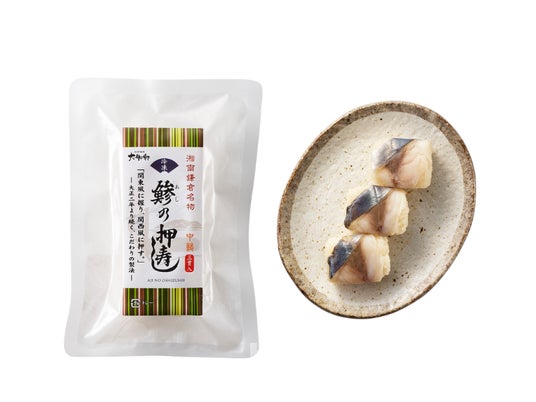 湘南鎌倉名物、100年続くベストセラーの味を作りたての美味しさそのままに冷凍しています。伝統の合わせ酢で締めた中鯵の削ぎ身と、赤酢入りの合わせ酢を使用した酢飯を、関東風に握り関西風に押す手法で押寿しに仕立てています。