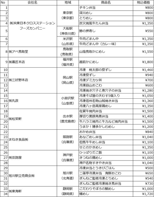 ※通常の駅弁販売箇所(冷凍駅弁は販売していません)
