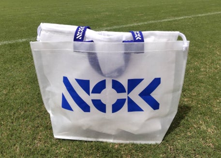 本試合限定のNOKと福島ユナイテッドFCのコラボレジャーシートバッグです。半透明のレジャーシート素材にNOKのロゴと福島ユナイテッドFCのロゴが入っています。手提げ用と肩掛け用の長さが違う持ち手がついています。