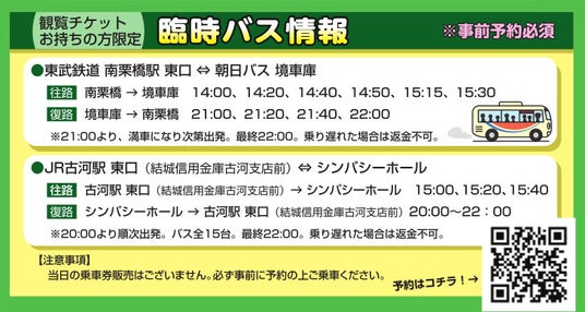 - 境町には鉄道の駅がございません。観覧チケットをお持ちの方限定で、JR古河駅・東武鉄道南栗橋駅からの臨時バスをご利用いただけます。乗車には事前予約が必要です。当日販売はございませんのでご注意ください。