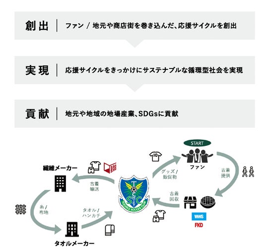地域のファンを起点としたアップサイクルで、モノの付加価値とともに、地域におけるファン / 地元や商店街を巻き込んだ、応援サイクルを創出。応援サイクルをきっかけにサステナブル(持続可能)な循環型社会の実現と、地元や地域の地場産業、SDGsにサッカーを通じ社会貢献を目指します。