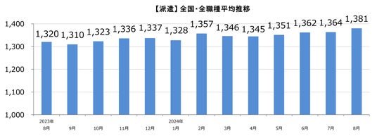 【派遣】全国・全職種平均時給は1,381円。前月比+17円。前年同月比+61円