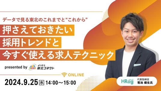 東北電力グループ、株式会社トークネット(本社:宮城県仙台市、代表:紀野國 文康)は、2024年9月25日(水)によりそう東北コネクト主催の無料ウェビナー「データで見る東北のこれまでと”これから” 押さえておきたい採用トレンドと今すぐ使える求人テクニック」を開催いたします。