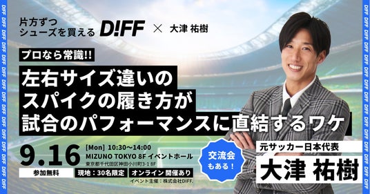 ビジョン「足が喜ぶ、あしたをつくる。」を掲げ、片方ずつシューズを買えるサービス『DIFF.』の運営を行う株式会社DIFF.(本社:大阪市北区、代表取締役:清水雄一)は、元日本代表サッカー選手 大津祐樹氏を招き、スパイクとパフォーマンスの関係性を紐解くイベントを開催いたします。元日本代表選手を招いたイベントの開催は、当社初の試みとなります。