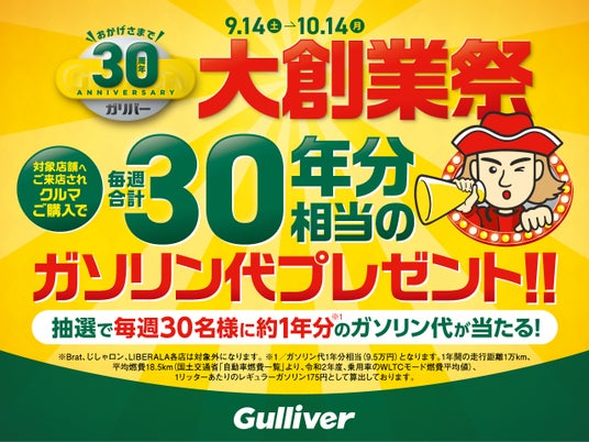 創業30周年の感謝を込め、全国の「ガリバー」店舗にご来店(※1)いただき、おクルマを購入されたお客様の中から、毎週抽選で30名様に1年分のガソリン代(9万5,000円 ※2)をプレゼントするキャンペーンを実施いたします。2024年9月14日(土)から10月14日(月)までにご購入されたお客様が対象となります。ぜひ、この機会にご購入いただいたおクルマで、さまざまな体験や思い出を作っていただければ幸いです。